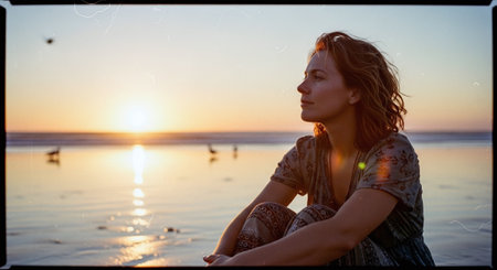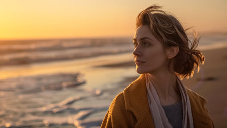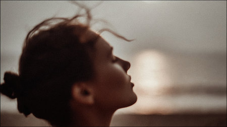A serene moment captured on a beach at sunset, where a woman stands with the wind gently blowing through her hair, and the peaceful ocean in the background