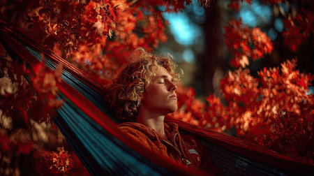 Young man relaxing in hammock in the autumn forest. Fall season.