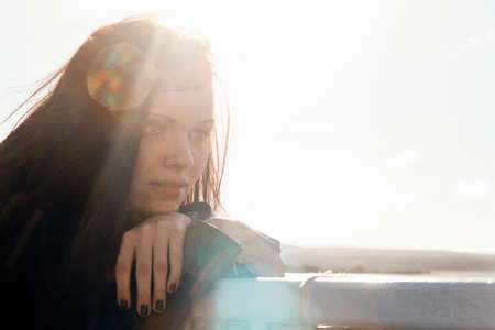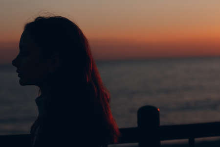 Young woman enjoying the sunset. A woman's profile is silhouetted against a soft, muted sunset, her hair gently blowing in the wind, evoking a sense of peace and tranquility. Dreamy mood girl.