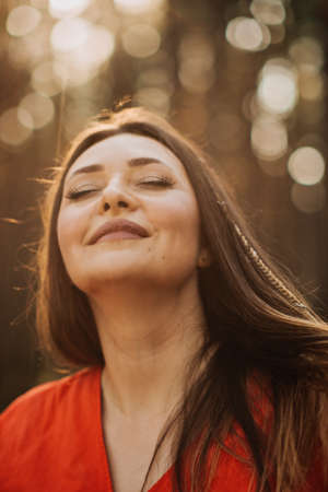 Outdoor portrait of beautiful smiling woman in sunlight. Smiling relaxing woman with boho hair style.