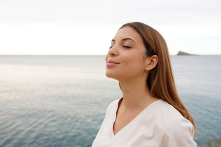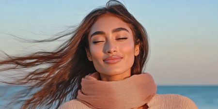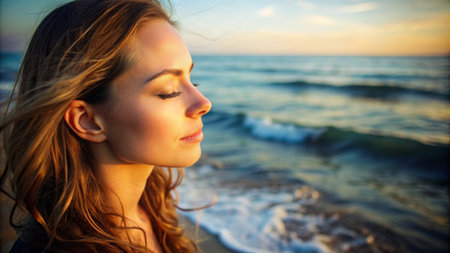 A woman stands at the beach with her eyes closed smiling gently as the wind plays with her hair. The background features a serene seascape at sunset creating a peaceful atmosphere.