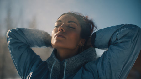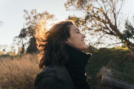 A woman stands outside with her eyes closed and a slight smile on her face. She seems to be enjoying the fresh air and sunlight in a natural setting. Her hair flows in the wind.