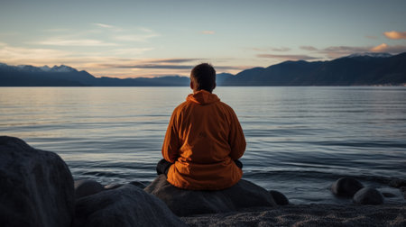 A man sits on a rock by a lake, looking out at the water. The scene is peaceful and serene, with the man's reflection in the water adding to the sense of calm. Concept of solitude and contemplation