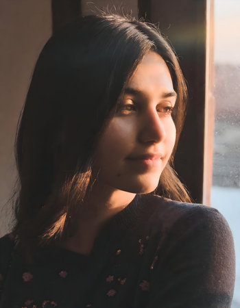A young woman with freckles and curly brown hair, wearing a dark hooded jacket, looks thoughtfully into the distance as the sun sets.