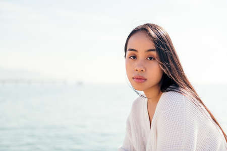 young asian woman dressed in white looking at camera with serious and relaxed expression, concept of beauty and purity