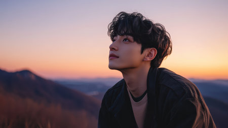 A young man gazes thoughtfully at the horizon during sunset, surrounded by hills and valleys. The warm hues of the sky create a peaceful atmosphere for introspection.