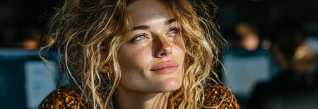 A young woman with curly hair and freckles looking thoughtfully in an office setting