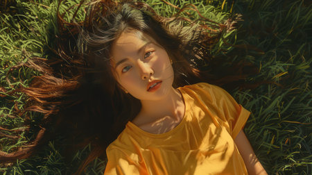 A young woman with long brown hair is lying on her back in a field of grass. She is wearing a yellow shirt and has sunlight on her face. She is looking directly at the camera with a soft, calm expression. The image has a warm, natural feel.