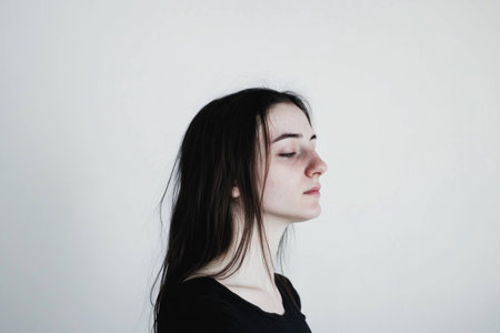 Portrait of a young woman with long black hair, wearing a black shirt, reflecting serenity and introspection against a minimalist white background
