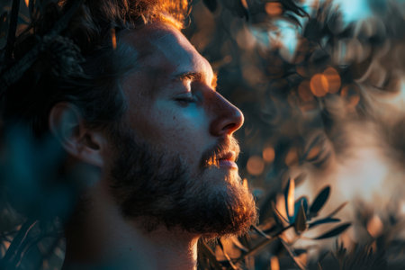 Sunlight man nature alone concept. Unity with the nature. Inner harmony.