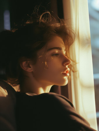 A young woman sits near a window with soft light coming in. She has curly hair and is lost in thought. The room has a simple background with a peaceful atmosphere.