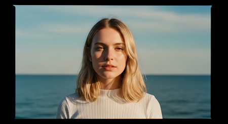 A young woman with blonde hair and a white sweater stands in front of a vast ocean under a blue sky with clouds, looking directly at the camera with a neutral expression.