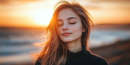 Golden Hour Beauty Portrait of a Young Woman with Eyes Closed at Sunset, Ocean Background