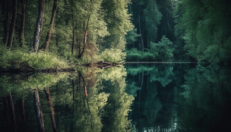 Tranquil scene of green tree reflection in pond generated by artificial intelligence