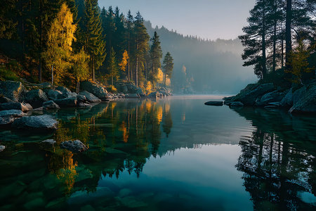 Pine trees reflecting in a calm lake with fog and autumn colors at sunrise