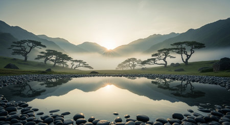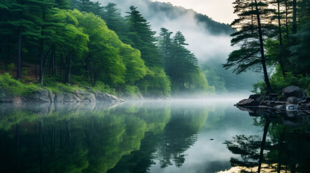 early morning mist blankets the serene forest of wolding river in korea's hancheongnam province. this captivating photo captures the beauty of nature with its reflections and mirroring effect. the lush shades of light green and green create a soothing atmosphere. shot with a nikon f2, this professional photograph showcases an eye-catching composition, making it a perfect addition to any collection. ai generated
