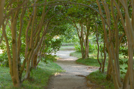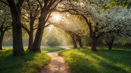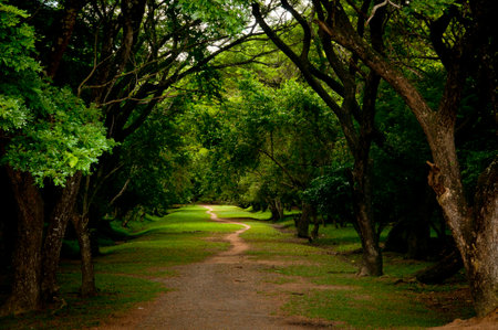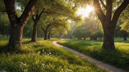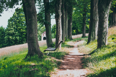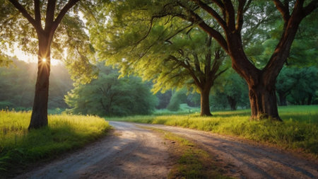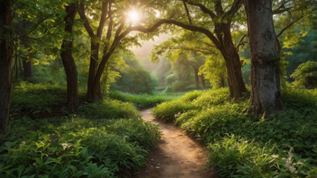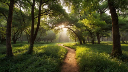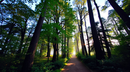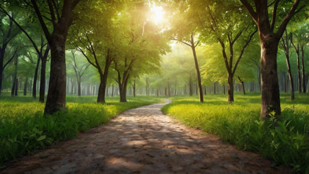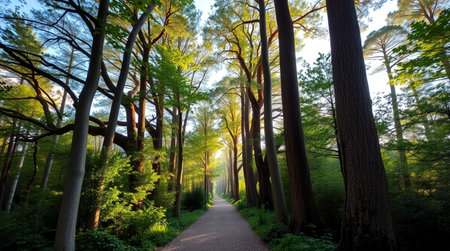 fairy tale forest outdoor park nature scenery landscape of path alley way place for walking in morning fresh weather time with sun rays through tree