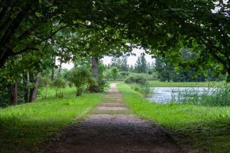 The alley without people in the old green park with big high trees on the cloudy rainy day.