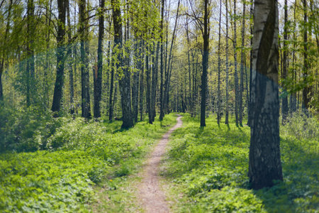 Bright green forest natural walkway in sunny day light. Sunshine forest trees. Sun through vivid green forest. Peaceful forest with sunlight. Forest in light. Summer forest. Green forest nature