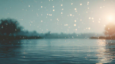 Captivating scene featuring raindrops falling on a tranquil water surface during sunrise, creating a peaceful ambiance that showcases the beauty of nature.