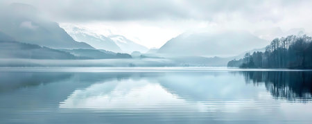A serene mountain lake at dawn background with calm waters, rising mist, and the textures of rugged peaks and tranquil reflections, creating a peaceful and majestic natural scene.