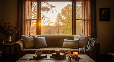 Warm interior, large window, view of misty autumn landscape