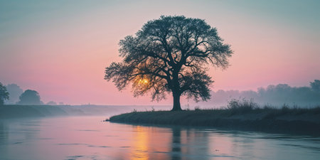 A stunning scene capturing a solitary tree standing by a calm lake, its reflection beautifully mirrored in the water beneath a gentle morning fog, evoking serenity and stillness.