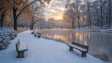 Winter morning light reflects on a serene pond surrounded by snow-covered benches and trees in a peaceful park setting. Generative AI