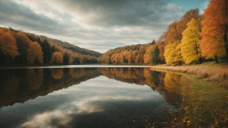 Calm river with autumn reflections, vibrant colors, peaceful scene, copy space