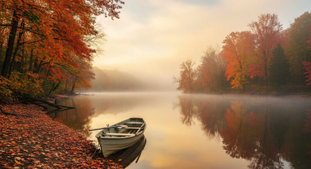 An autumn lake forest reflection calm water morning mist red foliage colorful tree nature landscape tranquil scene peaceful mood seasonal color serene autumn lake with forest reflection and calm