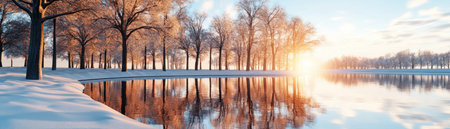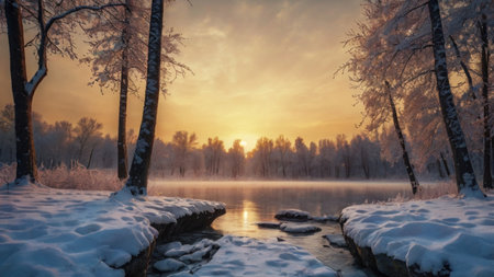 A serene winter scene unfolds at sunrise Frosty branches, glistening with dew, mirror in icy waters, surrounded by a quiet forest Golden sunlight pierces the chill, painting snow-covered trees in a soft, warm glow Experience the tranquility of this peaceful, snowy landscape AI Generative