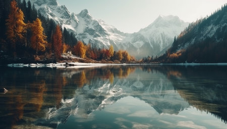 Majestic mountain range reflects tranquil autumn beauty generated by artificial intelligence