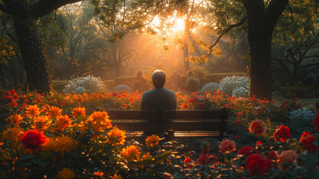 A person sits alone on a wooden bench in a vibrant garden, bathed in warm sunlight. Lush green foliage and colorful flowers frame the scene, creating a tranquil and peaceful atmosphere. The sun shines through the trees, casting a golden glow on the surrounding landscape.