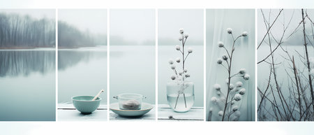 Collage of a cup of tea on the background of the lake in winter