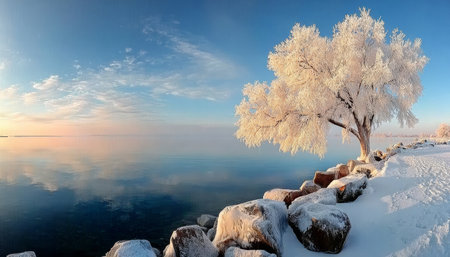 Crisp Winter Tranquility Frosty Tree Shimmers by Calm Waters Under a Soft Pastel Sunrise