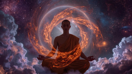 A monk sits peacefully in meditation wearing a yellow robe. The background features a stunning cosmic scene filled with colorful stars and galaxies creating a serene atmosphere.