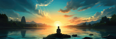 A peaceful illustration of a man in lotus pose, meditating under a mesmerizing, glowing sky. Perfect for meditation, yoga, and mindfulness themes. Created using Generative AI.