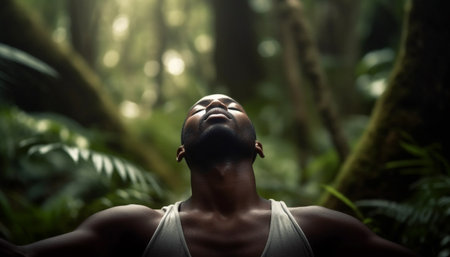 Young African athlete meditating in tranquil forest, eyes closed, smiling generated by artificial intelligence