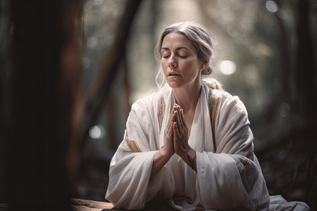 a woman in white robes meditating with her eyes closed and hands clasped over her chest, surrounded by trees. Generative Ai