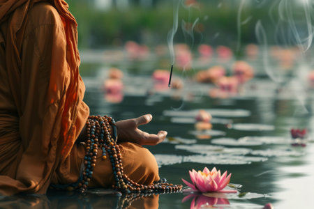 A Buddhist monk in deep meditation beside a serene lotus pond, with prayer beads and incense, symbolizing tranquility.