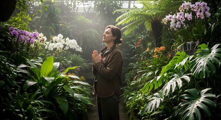 A woman stands with hands clasped in prayer or meditation amidst the lush greenery of a greenhouse. Sunlight filters through the mist and orchid flowers, creating a serene and spiritual atmosphere.