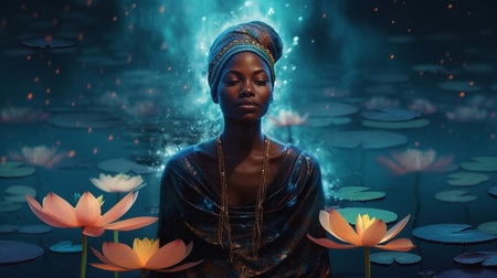 Beautiful african american woman in lotus pond..generative ai
