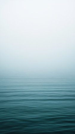 Calm ocean waters create a serene atmosphere as mist envelops the horizon at dawn, blending soft colors into a peaceful scene, evoking tranquility and reflection.