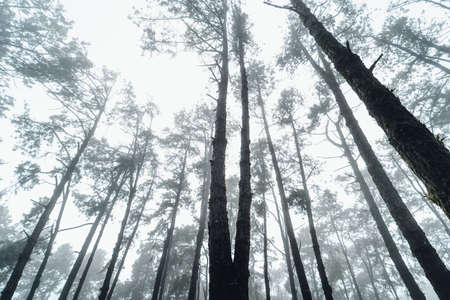 A beautiful shot of a thick forest in fog with pine trees and white space for text