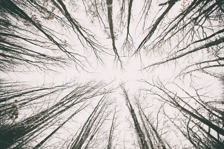 Looking up the trees and leaves from low angle view in autumn forest. Vintage color tone.