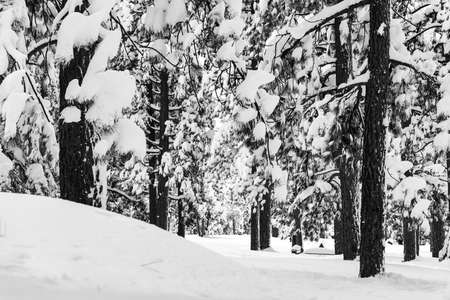 A vertical grey scale shot of beautiful pine trees covered in snow