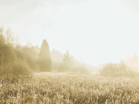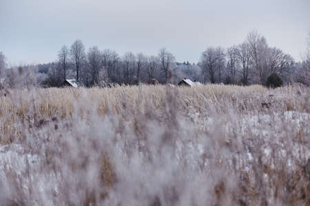 Frosty morning in the countryside. Dramatic and picturesque scene.