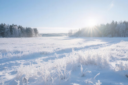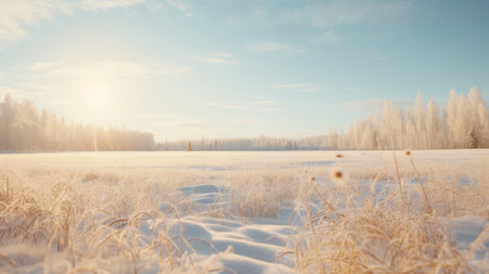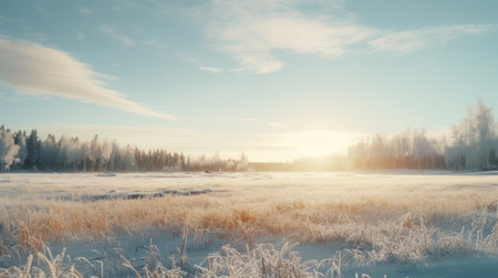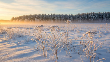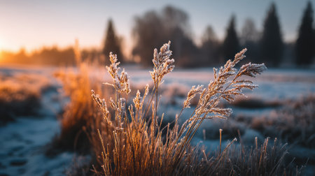 Frosty grass glistens in the early morning sunlight at a serene winter landscape