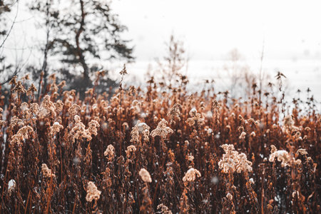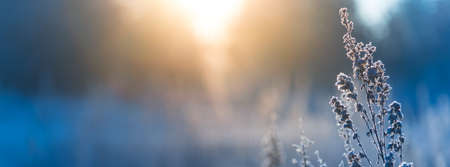 Close-up view of frost-covered plants in a winter field. Serenity and peace.
