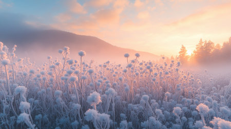 A stunning view of a frost-covered meadow illuminated by a colorful sunrise, surrounded by misty mountains, creating a serene and tranquil atmosphere.